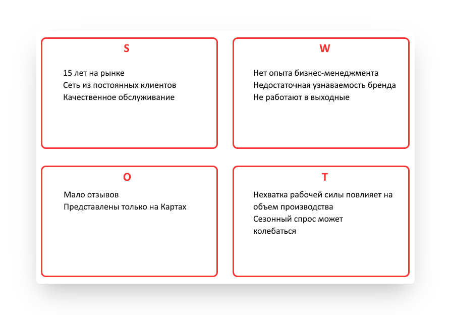 Это пример распределения характеристик конкурентов с помощью SWOT-анализа: