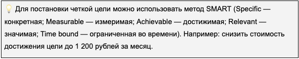 Если цель не определена → вы не будете знать, как оценить влияние или ценность проделанной вами работы → выше затраты на разработку кампаний.