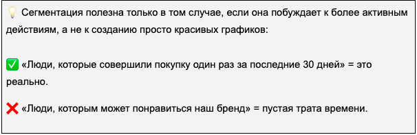 Сегментация выполнена → под каждую группу ЦА свой оффер и посадочная страница → точное попадание в боли и мотивации → выше продажи.