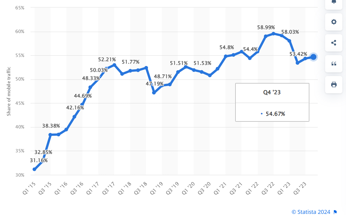 Доля мобильных устройств по трафику во всем мире.