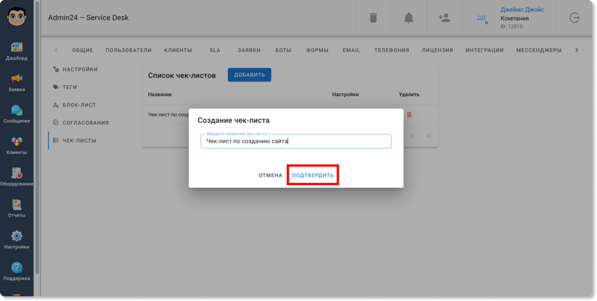 Далее введите название чек-листа, нажмите «Подтвердить».