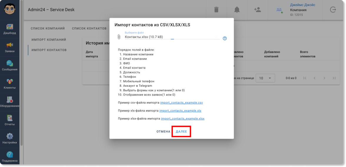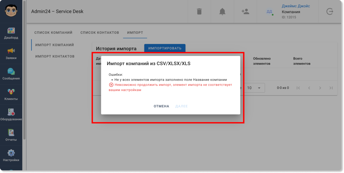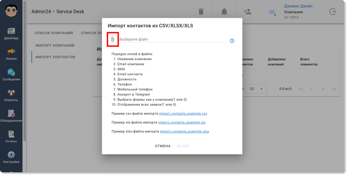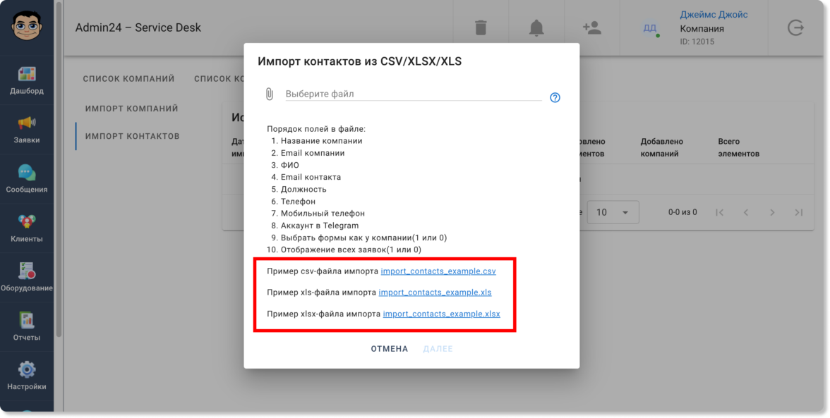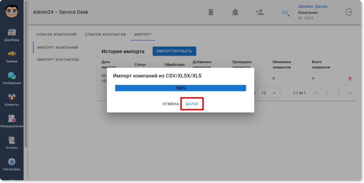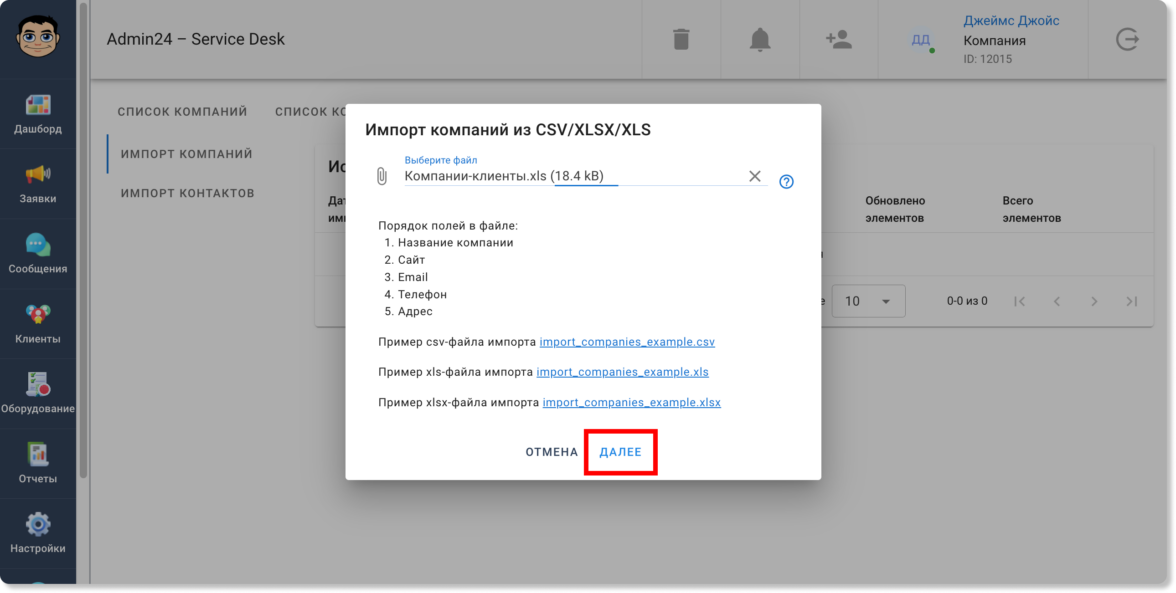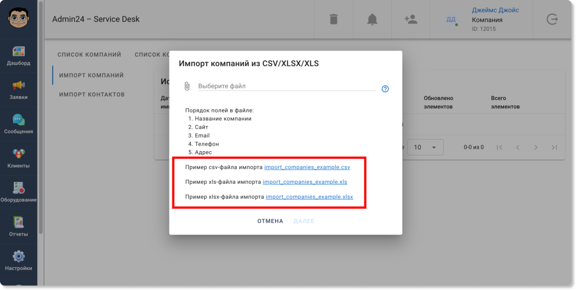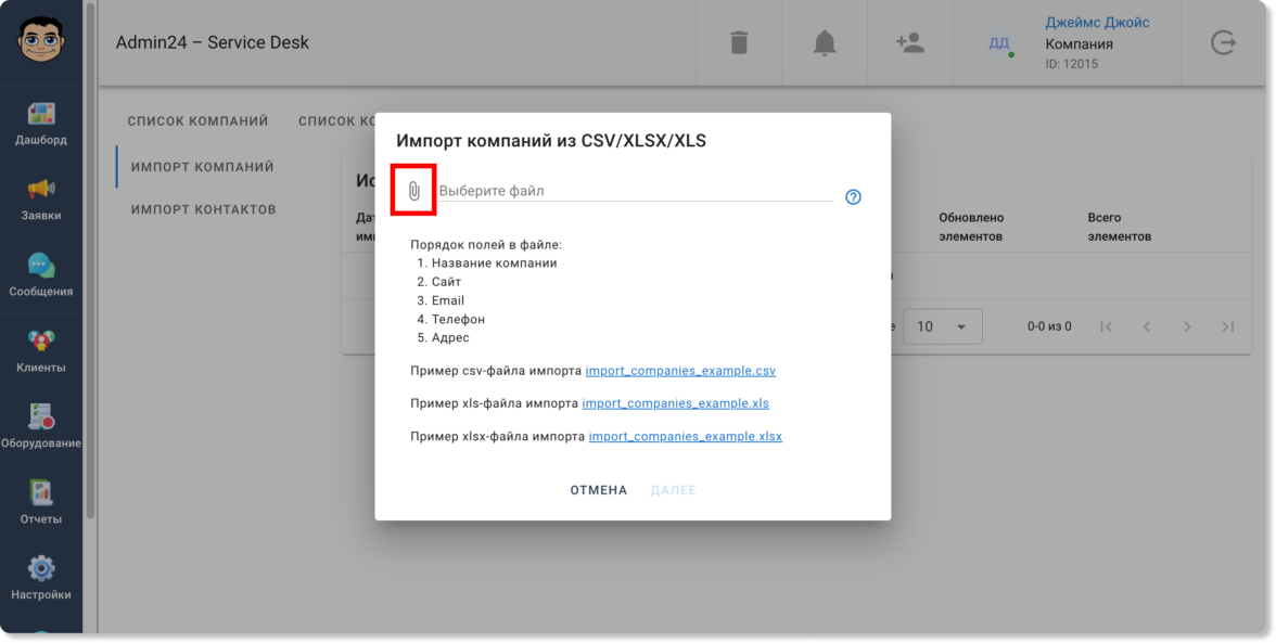 В Admin24 появилась возможность импортировать компании из файлов CSV, XLS и XLSX.