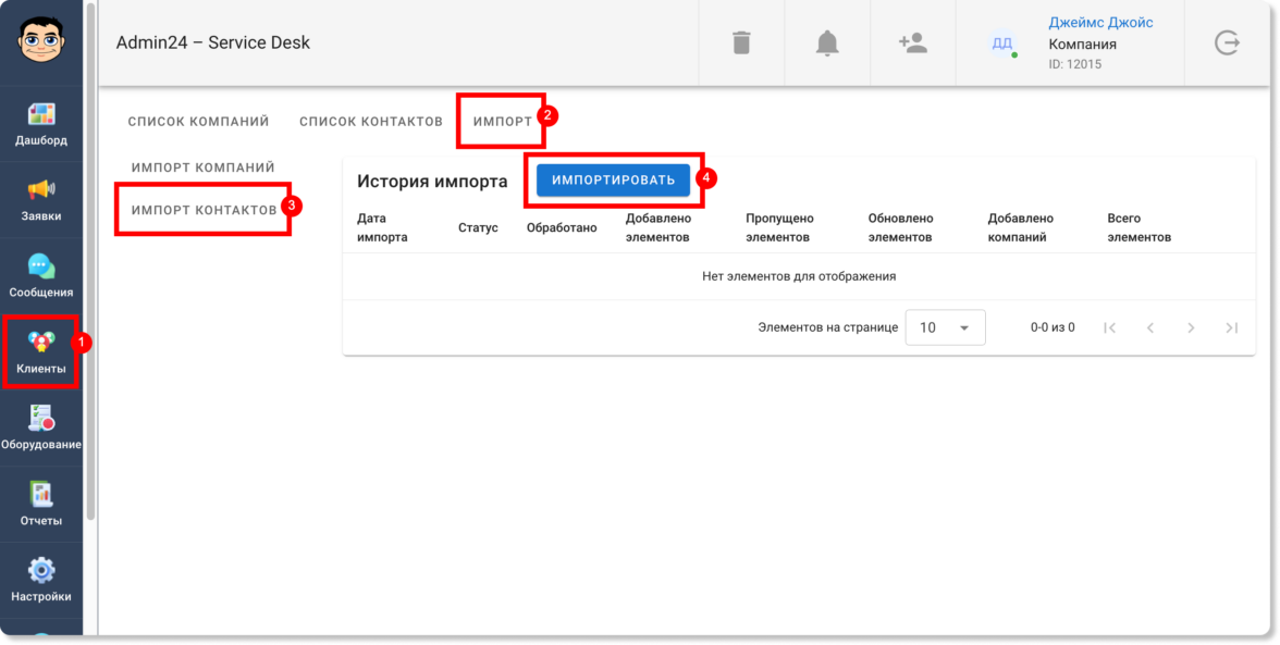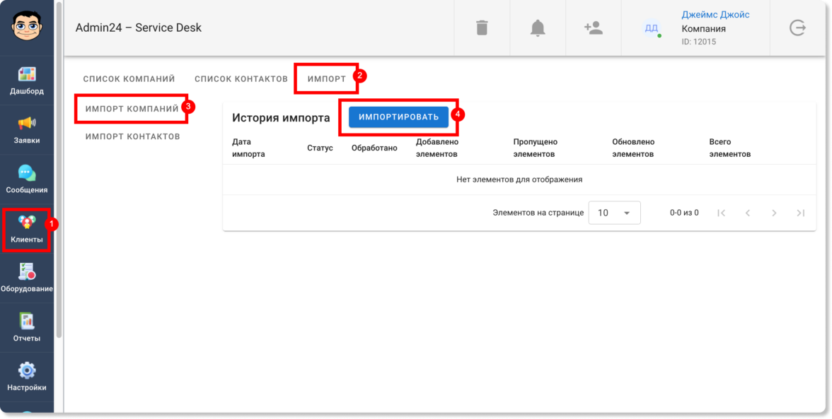Для этого откройте раздел «Клиенты», перейдите во вкладку «Импорт», далее — в «Импорт компаний» и нажмите кнопку «Импортировать».