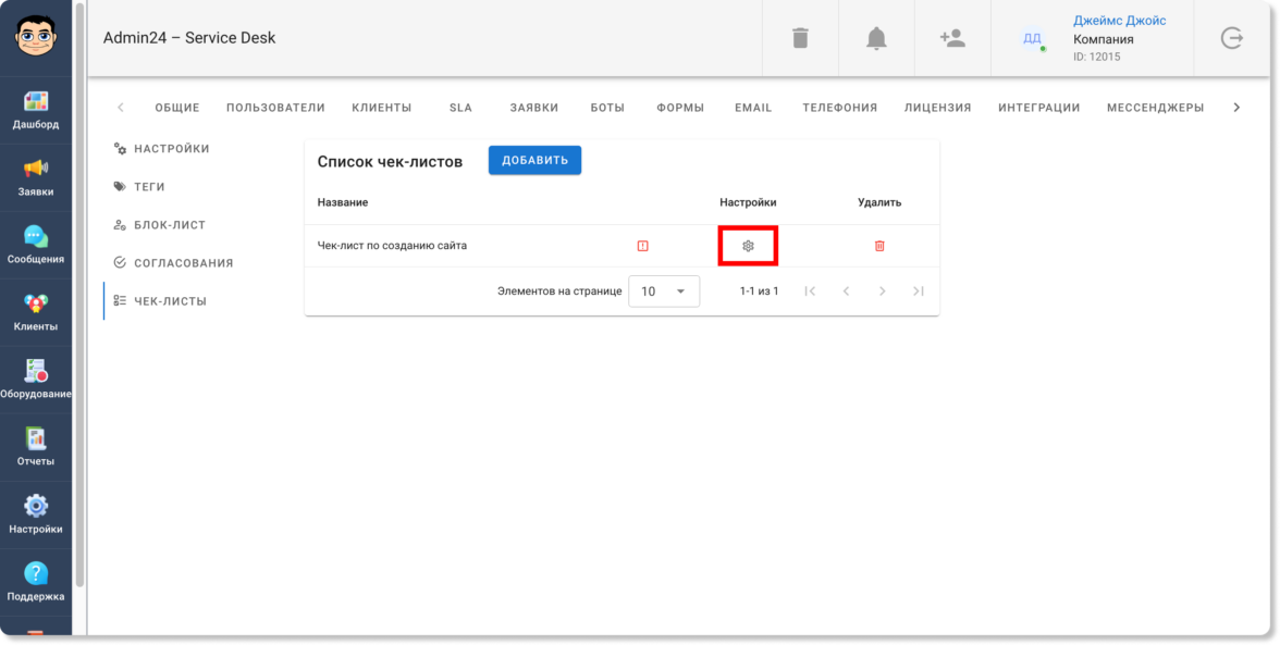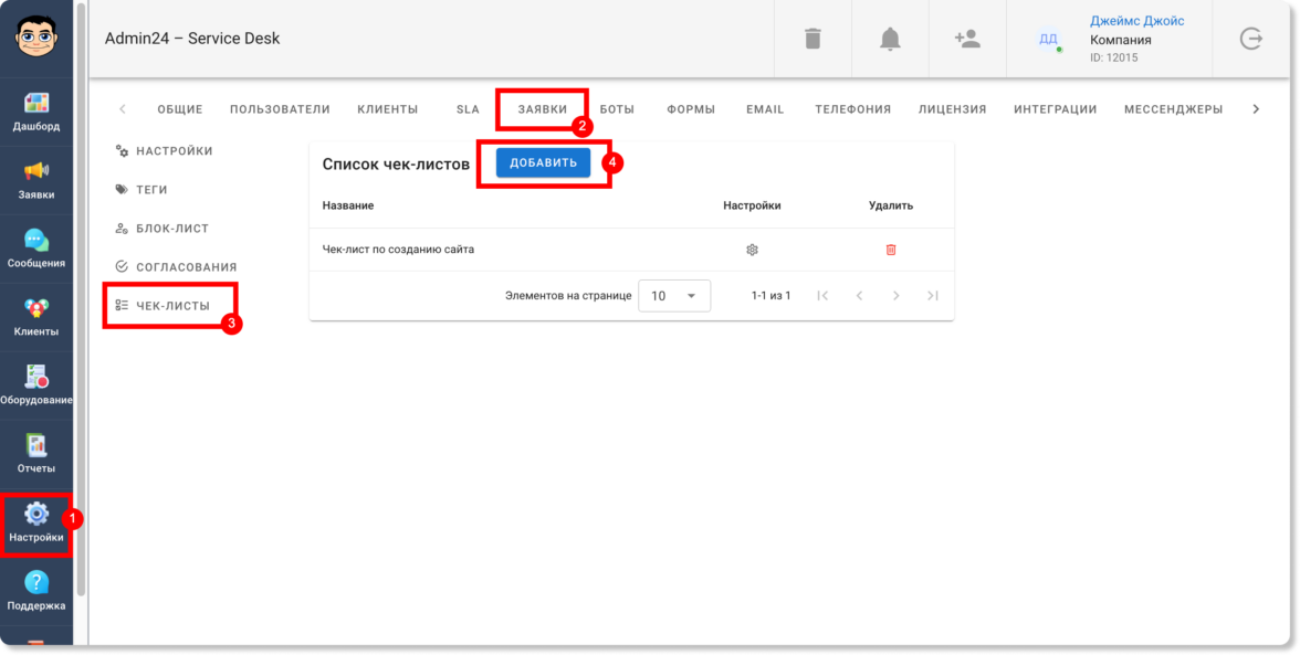 Чтобы настроить функционал, перейдите в раздел «Настройки» → «Заявки». Откройте вкладку «Чек-листы» и нажмите кнопку «Добавить».