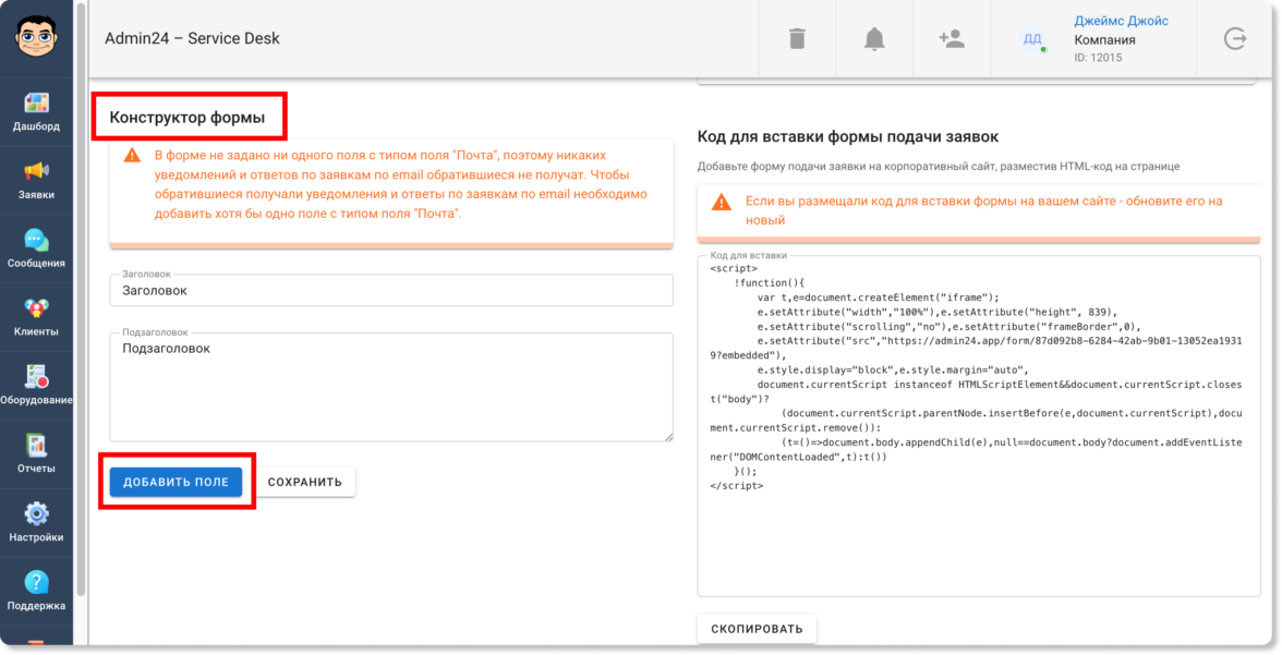 Далее прокрутите страницу до конструктора форм. Нажмите на кнопку «Добавить поле».