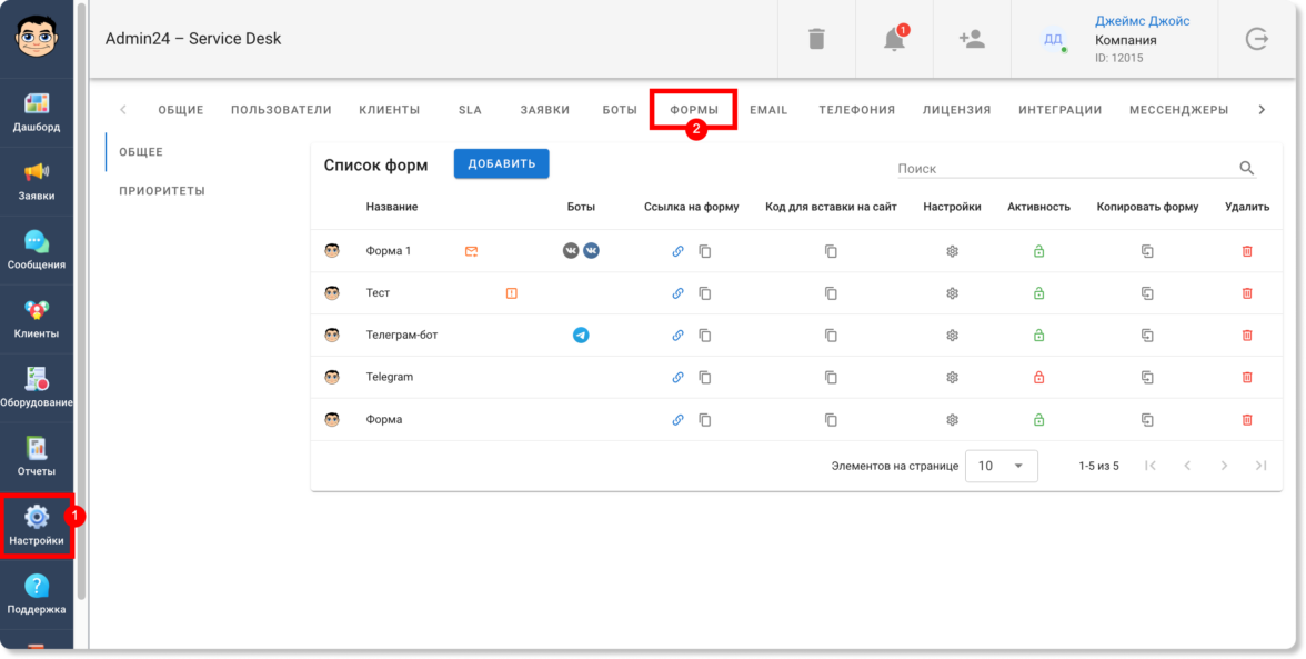 Для добавления в форму поля «Множественный выбор» перейдите в раздел «Настройки» → «Формы» и откройте нужную форму, нажав на шестеренку напротив нее.