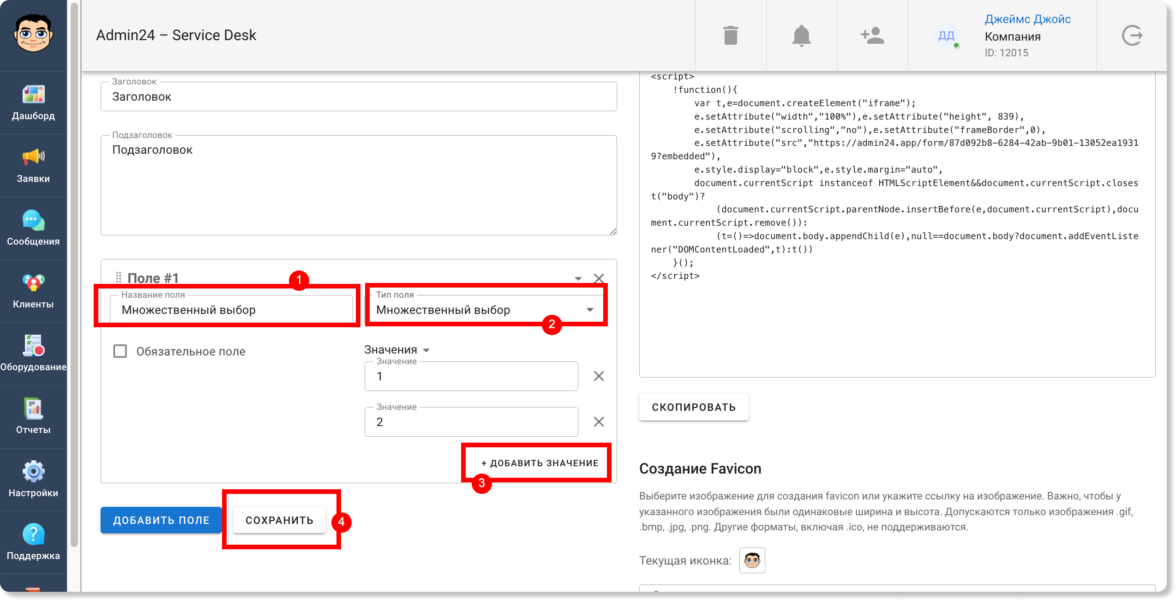 Укажите его название, а в графе «Тип поля» выберите «Множественный выбор». Далее добавьте значения — это варианты для выбора, которые будут отображаться клиенту.