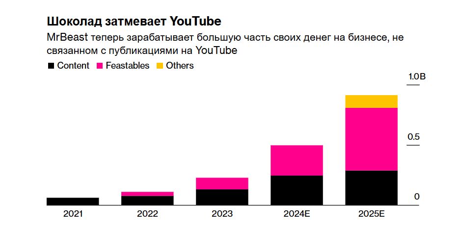 Настоящим источником дохода самого известного ютубера в мире Мистера Биста (MrBeast, настоящее имя — Джимми Дональдсон) являются продажи шоколада. Его компания, Beast Industries — мажоритарный владелец производителя шоколада Feastables. В 2024 году шоколад Мистера Биста принес выручку около $250 млн и прибыль более $20 миллионов, сообщает Bloomberg, ознакомившийся с документами, которые Дональдсон отправил потенциальным инвесторам. Медиабизнес Beast Industries, в который входят его каналы в соцсетях и реалити-шоу для Amazon Prime Video, в прошлом году показали аналогичную прибыль при убытках почти $80 млн. Свыше 90% от выручки медиаподразделение потратило на съёмку новых видео.