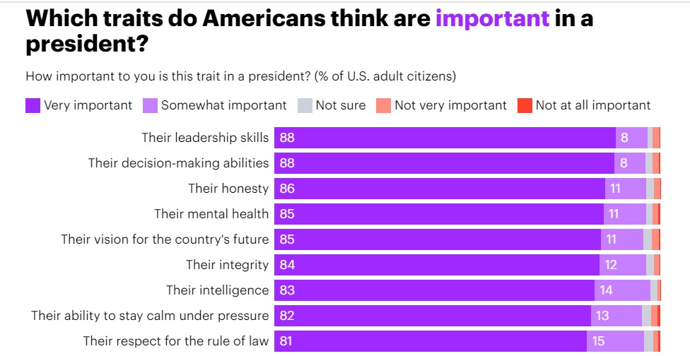 Самыми важными для президента, по мнению избирателей, оказались личностные качества. 88% опрошенных назвали очень важными лидерские навыки и способность принимать решения. На третьем месте среди качеств по популярности оказалась честность — 86% (что, серьезно?) Душевное здоровье (а кого вы имели в виду?) и видение будущего страны посчитали очень важным 85% опрошенных. Более 80% назвали очень важными (в порядке убывания) принципиальность, интеллект, способность сохранять спокойствие в условиях стресса, уважение к нормам права.