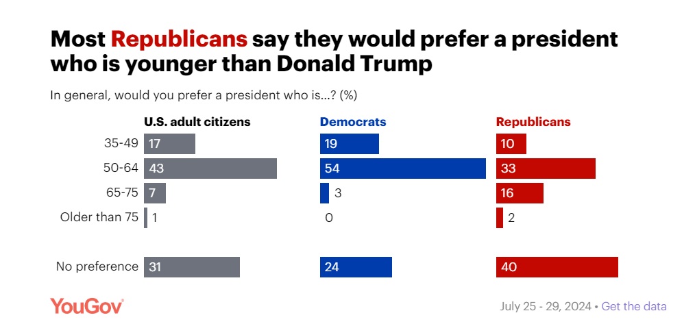 43% опрошенных предпочли бы, чтобы президенту было от 50 до 64 лет. 17% высказались за президента, которому меньше 50, и всего 8% хотели бы, чтобы президент был старше 65 лет. Демократы более склонны к тому, чтобы президент был моложе, а республиканцы чаще отвечали, что возраст им не важен. Только 2% республиканцев сказали, что хотят, чтобы президент был старше 75 лет (как Дональд Трамп), но 40% республиканцев возраст президента не волнует.
