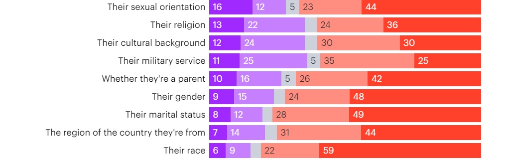 Посмотрим, какие характеристики оказались наименее важными. Оказывается, меньше всего американцев интересует внешняя привлекательность президента (55% опрошенных ответили, что это для них совсем не важно, 28% — не очень важно). Мало кого волнует и раса президента (для 59% это совсем не важно, для 22% не очень неважно). В число наименее важных характеристик также вошли сексуальная ориентация, вероисповедание, пол, наличие семьи, культурная идентичность. Мало интересует избирателей, из какого региона страны будет президент, прошло ли его детство в городе или деревне.