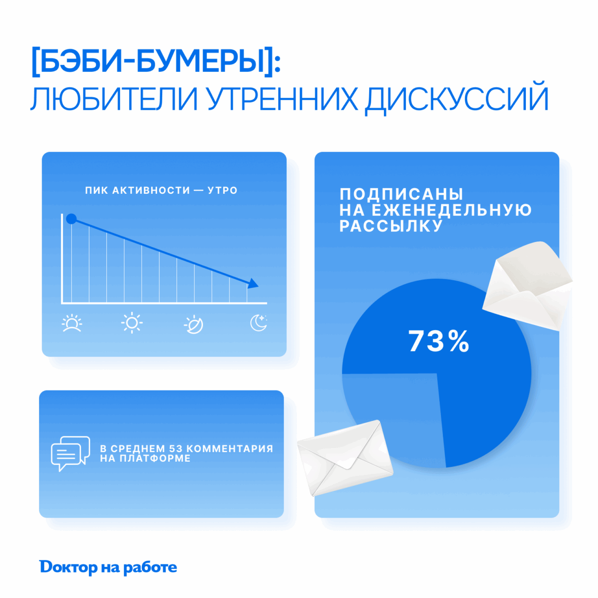 Опытные врачи со стажем 30–40 лет превратили платформу в виртуальную ординаторскую. Они заходят на сайт как на работу — утром, с чашкой кофе, и остаются активными до обеда. 73% из них подписаны на еженедельную рассылку и не пропускают ни одного важного обсуждения. Бэби-бумеры — настоящие мастера дискуссий. Средний врач этого поколения оставил 53 комментария на платформе, а некоторые написали тысячи развёрнутых ответов. Их публикации — это полноценные статьи объёмом более 3000 символов, где каждый случай разбирается до мельчайших деталей. В выходные они отдыхают от интернета: активность в субботу падает вдвое.