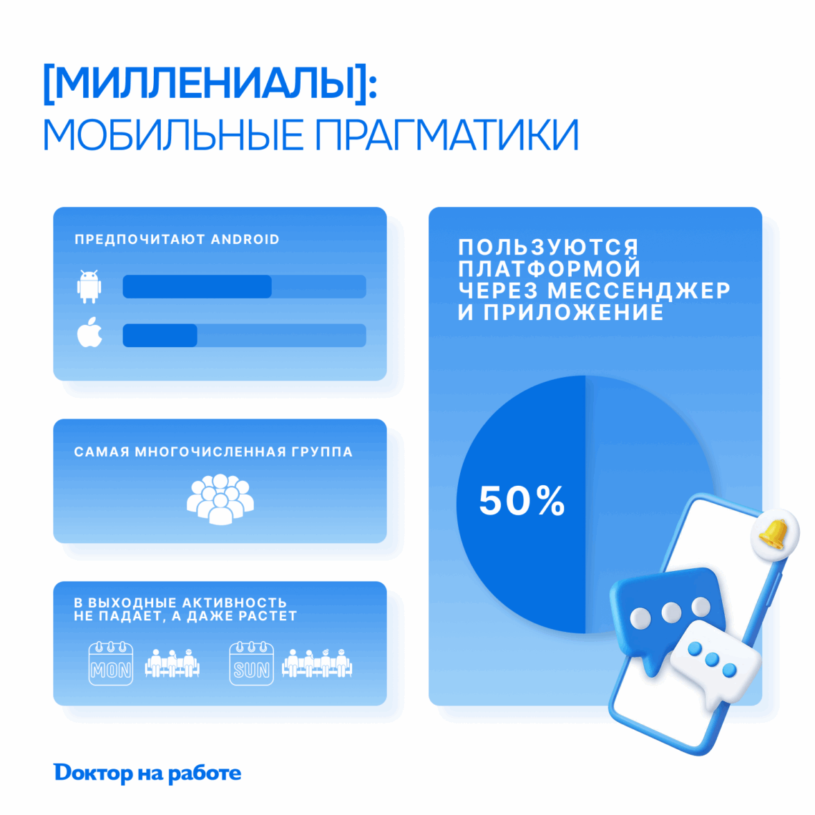 Самая многочисленная группа врачей на платформе совершила цифровую революцию. Только половина из них открывает сайт на компьютере — остальные читают коллег в мессенджере Докторграм или в мобильном приложении прямо между приёмами пациентов. Интересно, что миллениалы предпочитают Android айфонам, почти в два раза чаще используя эту ОС. Они активны в любое время суток и не делают перерывов на выходные — в субботу и воскресенье их активность даже выше, чем в середине недели. Миллениалы пишут короче старших коллег, но их комментарии — самые содержательные: в среднем 223 символа против 178 у поколения X.