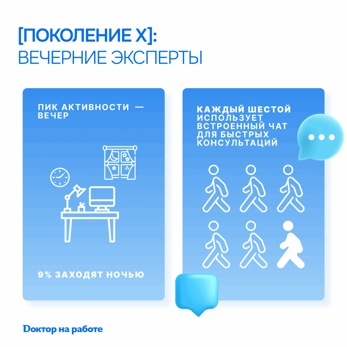 Врачи этого поколения — активно практикующие врачи, заведующие отделениями — весь день проводят у операционного стола, на приемах или на обходах. Они появляются на платформе после смены: пик активности приходится на вечер, причём 9% заходят уже ночью. У них есть любимые дни — вторник и пятница, когда нагрузка в ЛПУ чуть меньше. Поколение X пишет ёмко и по делу: средняя публикация — около 2000 символов, без лишней воды. Каждый 6-й врач использует встроенный чат для быстрых консультаций с коллегами.