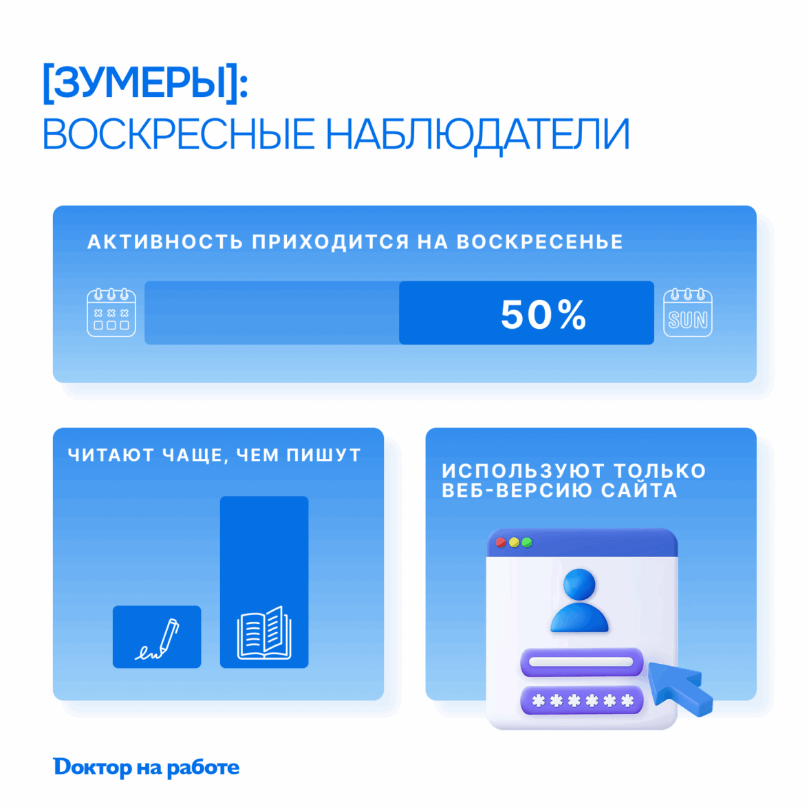 Молодые врачи — интерны, ординаторы, вчерашние выпускники — пока присматриваются к профессиональному сообществу. Они почти не публикуют собственный контент, но внимательно читают старших коллег. Зумеры — единственное поколение, которое массово заходит на платформу по воскресеньям: половина их активности приходится на этот день. Видимо, готовятся к новой рабочей неделе. Они используют только веб-версию сайта и практически не скачивают мобильные приложения — парадокс для поколения, выросшего со смартфоном в руках.