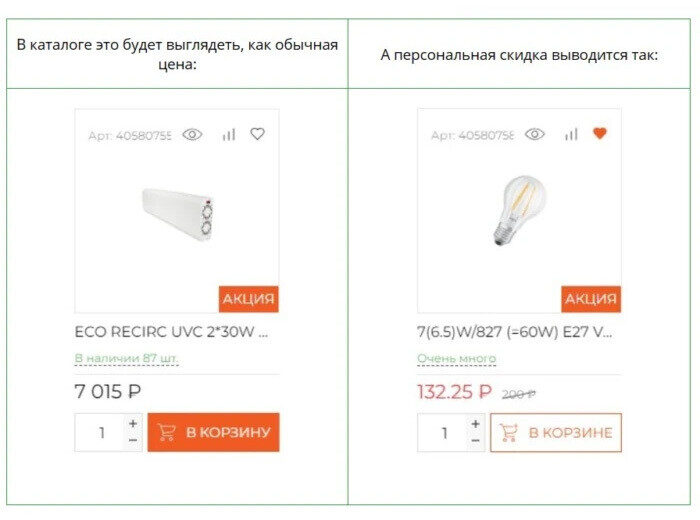 Персональные цены можно настроить для любого товара, для любого зарегистрированного пользователя. На сайте или в 1С указывается конечная цена товара для конкретного клиента.