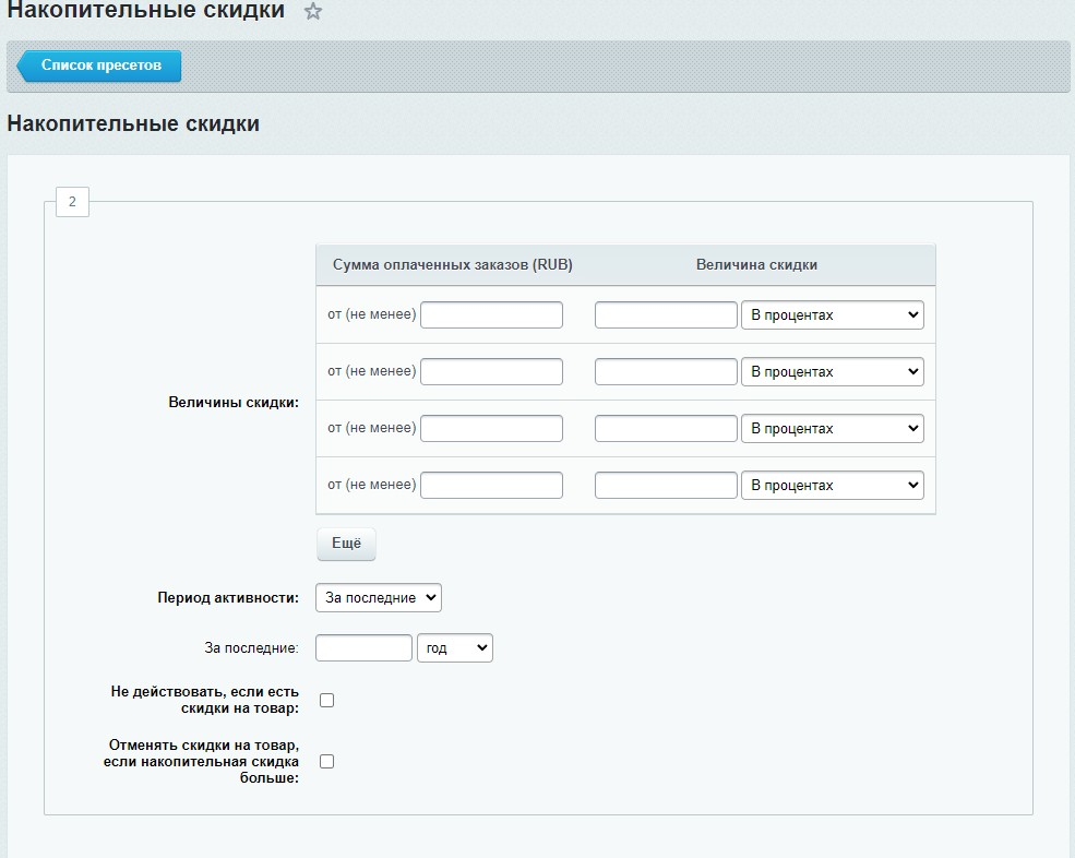 Разработчики Битрикса позаботились о пользователях и сделали функционал предустановленных маркетинговых акций! Настраивается все в дружественном интерфейсе, просто и понятно. Назначается группа пользователей для которых программа должна работать, можно пользоваться, этап пройден!