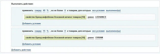 Двигаемся дальше. Что там с правилами корзины? Отлично, функционал есть, он даже удовлетворяет нашим хотелкам, касаемо логики предоставления скидки. Скидка должна предоставляться конкретному пользователю из группы «юридические лица» и предоставляться на определенные бренды. Проблема, которую данный метод решить не может — отображение скидки в общем каталоге.