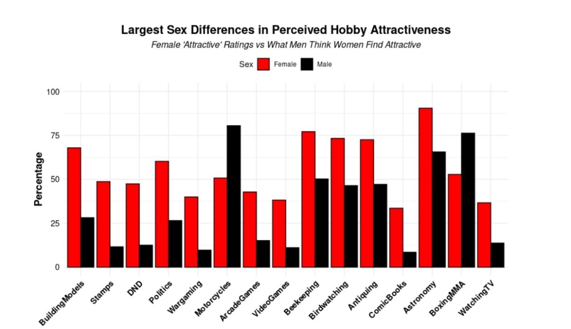 По отношению к некоторым способам проведения досуга оценки мужчин и женщин сильно разошлись. Как показал опрос, женщины гораздо лояльнее относятся (чем об этом думают мужчины) к таким видам мужского времяпрепровождения как сборка моделей всевозможной техники, игра в «Драконы и подземелья», филателия, интерес к политике, пчеловодство, наблюдение за птицами, просмотр телевизора, а также к электронным играм разного рода. При этом мужчины явно недооценивают женскую нелюбовь к мотоспорту, боксу и смешанным единоборствам.