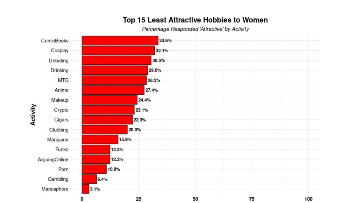 Если посмотреть на рейтинг самых непривлекательных с точки зрения женщин мужских занятий, то больше всего женщин отталкивает увлечение мэносферой (интернет-ресурсами, пропагандирующими маскулинность, враждебность к женщинам и антифеминизм). Только 3% назвали такое занятие привлекательным. Большинству женщин не нравится интерес к азартным играм, порнографии, онлайн-споры («в интернете кто-то неправ») и собирание большеголовых пластиковых фигурок Funko. Курение марихуаны привлекает 15% респонденток, хождение по клубам — 20%, курение сигар — 22,3%. Меньше четверти женщин радует увлечение макияжем и (неожиданно) увлечение криптовалютой. Возникает вопрос — интересно, нравится ли женам и подругам 17 биткоиновых миллиардеров из списка Forbes то, чем занимаются их спутники жизни? Самыми безобидными, но сравнительно малопривлекательными занятиями оказались коллекционирование комиксов, косплей (переодевание в костюме персонажей тех же комиксов и аниме) и увлечение дебатами (одобряют 33,6%, 32,1% и 30,5% соответственно).