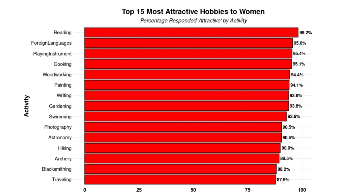98,2% женщин одобрительно относятся к тому, что мужчина в свободное время читает книги. В рейтинге самых привлекательных для женщин мужских хобби чтение заняло первое место. На втором месте по привлекательности (95,6%) — изучение иностранных языков. Игра на музыкальных инструментах лишь чуть-чуть менее привлекательна — 95,4%. Музицированию немного уступила кулинария — 95,1%. На пятом месте — работа по дереву (94,4%). На шестом — рисование (94,1%). Когда мужчина что-то пишет сам, то, с точки зрения женщин, это менее привлекательно, чем если бы он читал. Тем не менее, и у такого хобби хороший результат — 93,8%. Седьмое место литературное творчество делит с садоводством. На девятом месте — занятия плаванием (92,8%). Десятое место делят увлечение фотографией и астрономия (90,5%). В Топ-15 попали также увлечение походами (90%), стрельба из лука (89,5%), кузнечное дело (88,2%) и дальние путешествия (87,9%).