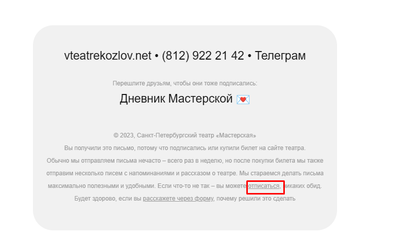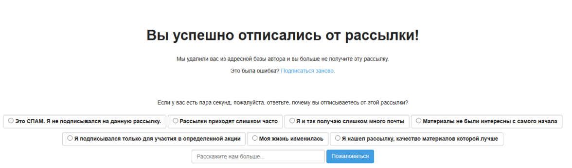 А еще часто усложняют сам процесс отписки. Например, просят указать причину, по которой пользователь больше не хочет получать письма. А без этого ответа не дают отписаться.