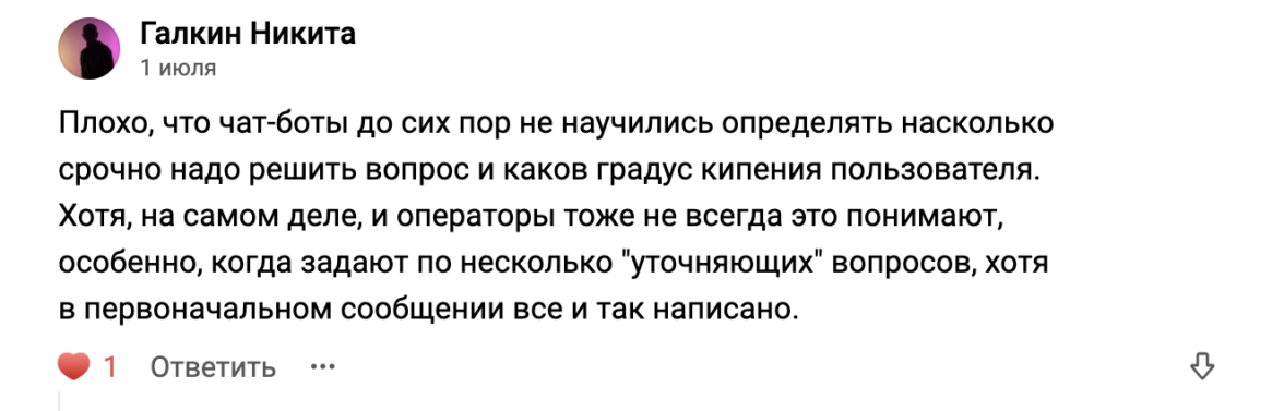 Клиент, обращаясь в службу поддержки, надеется встретить там чуткого и понимающего человека, с которым можно нормально поговорить. Особенно, если перед встречей с оператором ему пришлось пройти целый квест и пообщаться с ботом.