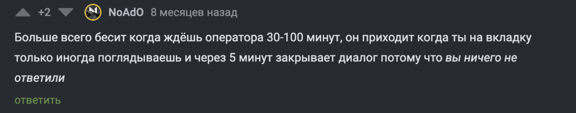 Представьте ситуацию. Пользователь пробрался через дебри диалога с чат-ботом, наконец, достучался до настоящего человека и уже почти обрадовался, что сейчас-то его проблему точно решат!