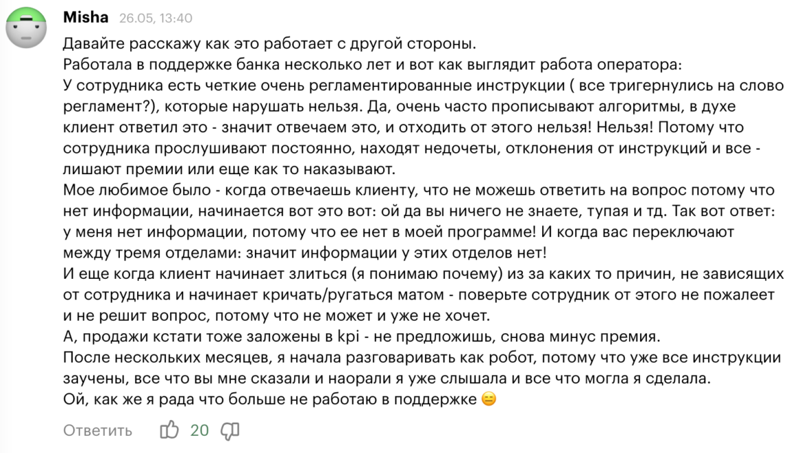 Вот, что пишет об этом девушка, которая работала в службе поддержки банка: