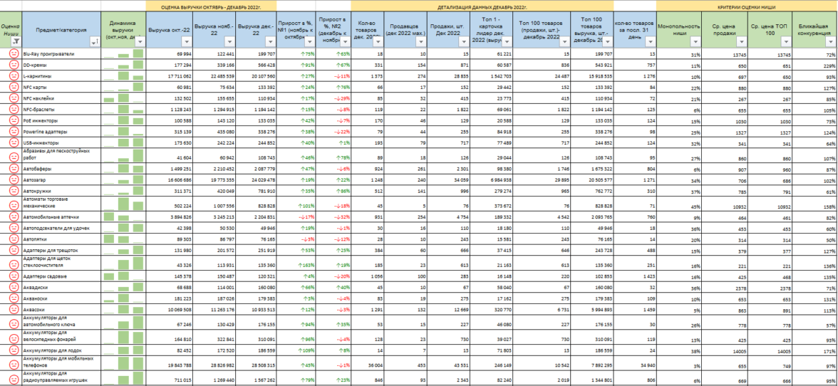 «Топ товаров для продажи на Wildberries» — это весомая таблица, где собрано более 5,5 тысячи ниш. На основе объемов продаж и выручки было отобрано 2,5 тысячи перспективных товаров для высоких продаж на Wildberries. Оценивалась ниша по нескольким параметрам. В их числе: