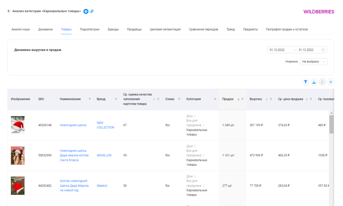 Наиболее успешный селлер в категории «Карнавальные товары» в последний месяц 2022 года получил выручку более 500 тысяч рублей, продавая на Wildberries новогоднюю шапку.