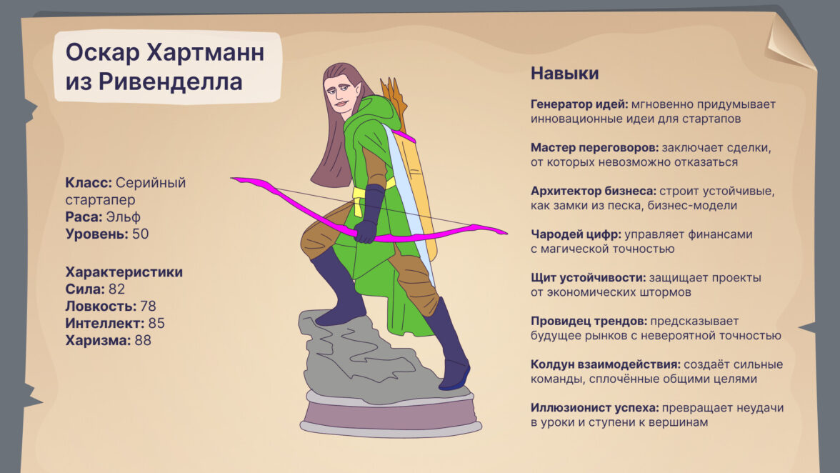 Мудрый эльф Оскар Хартманн родился в далёкой стране под названием Валиндор, затем перебрался в Ривенделл, где получил образование и сразу же стал заниматься бизнесом. Первым делом он открыл компанию, которая осуществляла доставку дорогих волшебных плащей, меняющих свой цвет. Там же можно было купить и популярные у модников мифрильные кольчуги, и даже драконий шлем.