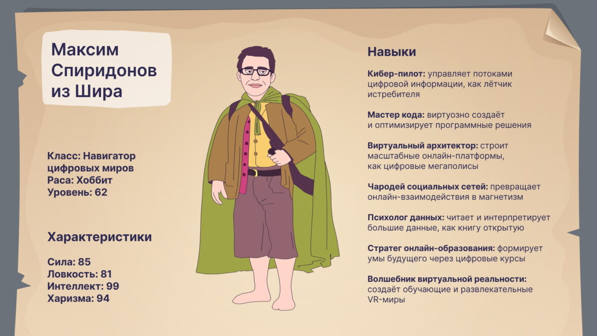 Несмотря на свою принадлежность к расе хоббитов, Максим Спиридонов мог похвастаться своим образованием и знаниями даже перед самыми мудрыми эльфами. Более того, он способствовал открытию большого количества образовательных центров для разных рас. Благодаря ему люди стали активнее изучать историю и менеджмент, гномы — прикладные науки, а эльфы — магию и ботанику. По мнению Спиридонова, представитель каждой расы, даже если это хоббит, должен стремиться стать великим волшебником!