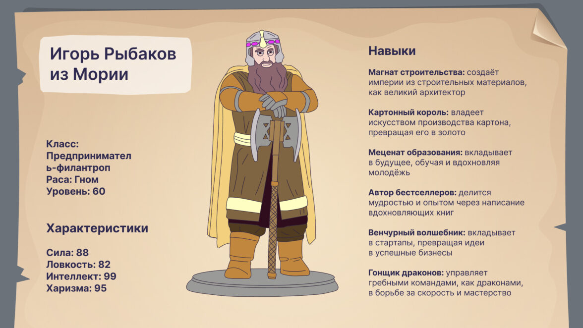 Рыбаков развивает программы материальной помощи бедным деревням, а также образовательные программы для женщин. Среди хоббитов и гномов женщинам тяжело добиться высокого положения, и предприниматель активно с этим борется!