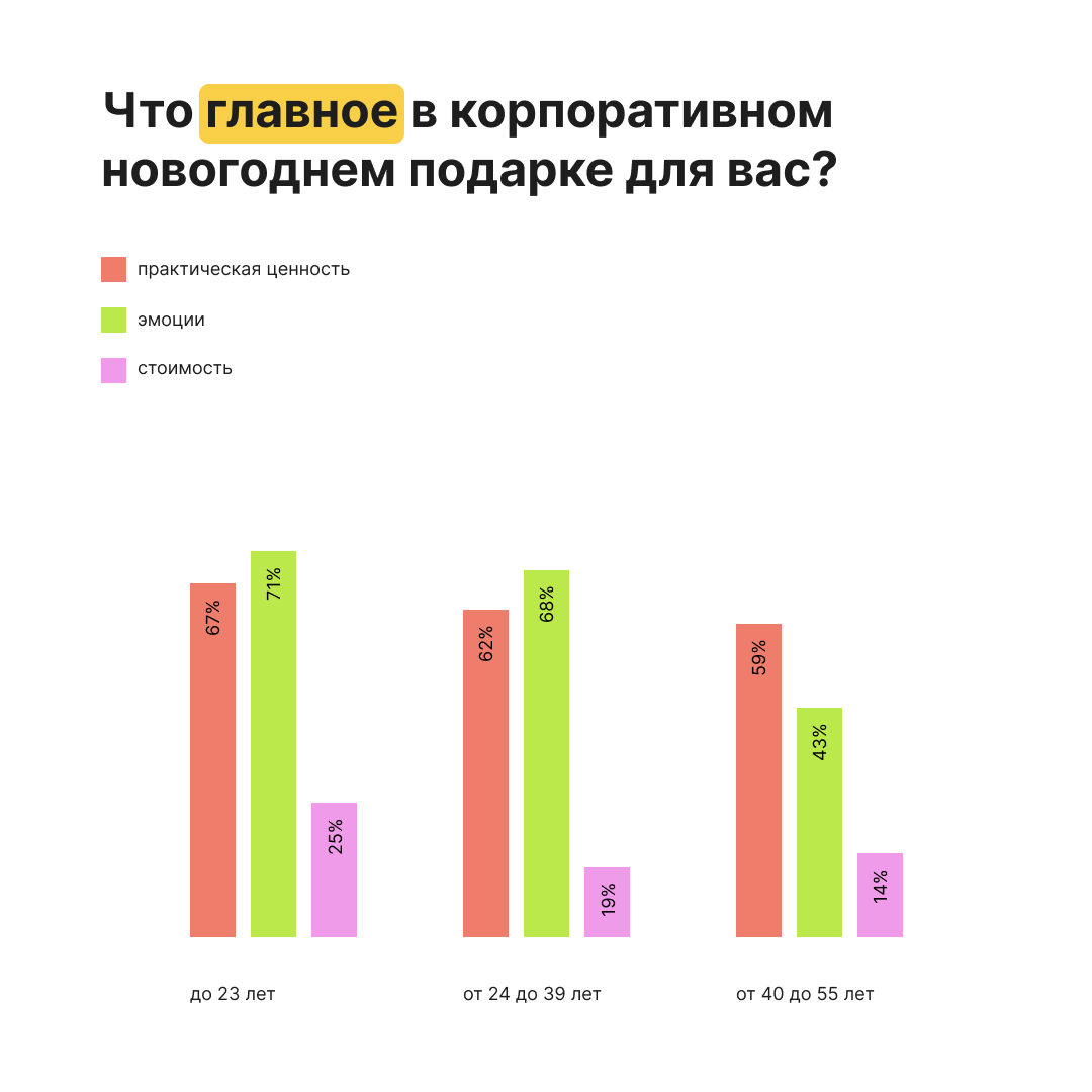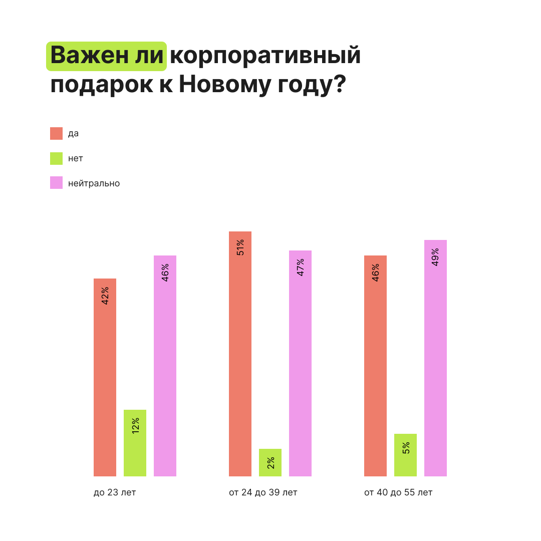 Несмотря на общие тренды, главное правило остаётся неизменным: подарок должен учитывать интересы сотрудников. Могут ли новогодние подарки повлиять на лояльность и мотивацию сотрудников? Ответ: частично. Более половины респондентов считают, что хороший подарок улучшает их отношение к компании, а у молодых сотрудников это даже может повысить желание работать лучше.
