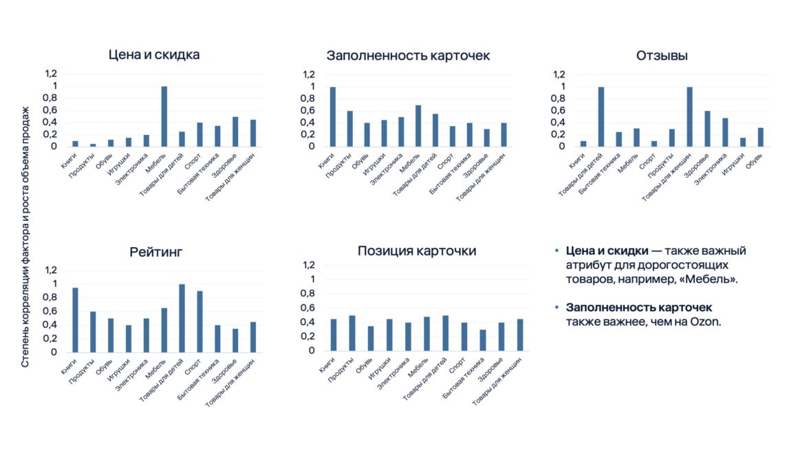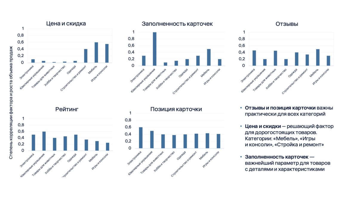 На основе данных за ноябрь 2024 — январь 2025 года эксперты сравнили влияние пяти ключевых факторов, которые влияют на продажи: цены и скидки, отзывы покупателей, заполненность карточек товаров, позиции в поиске и рейтинг товара — в разных категориях и на разных платформах.