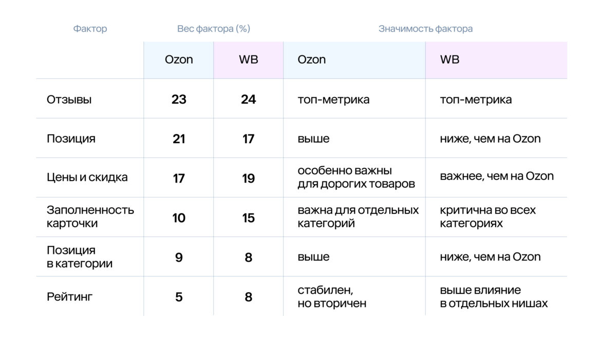 • на Wildberries цена и процент заполненности характеристик важнее, чем на Ozon;