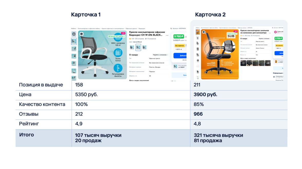 Пример: у компьютерного кресла в категории «Мебель» цену и отзывы покупатели учитывают больше, чем место в выдаче или полноту заполнения товарной карточки.