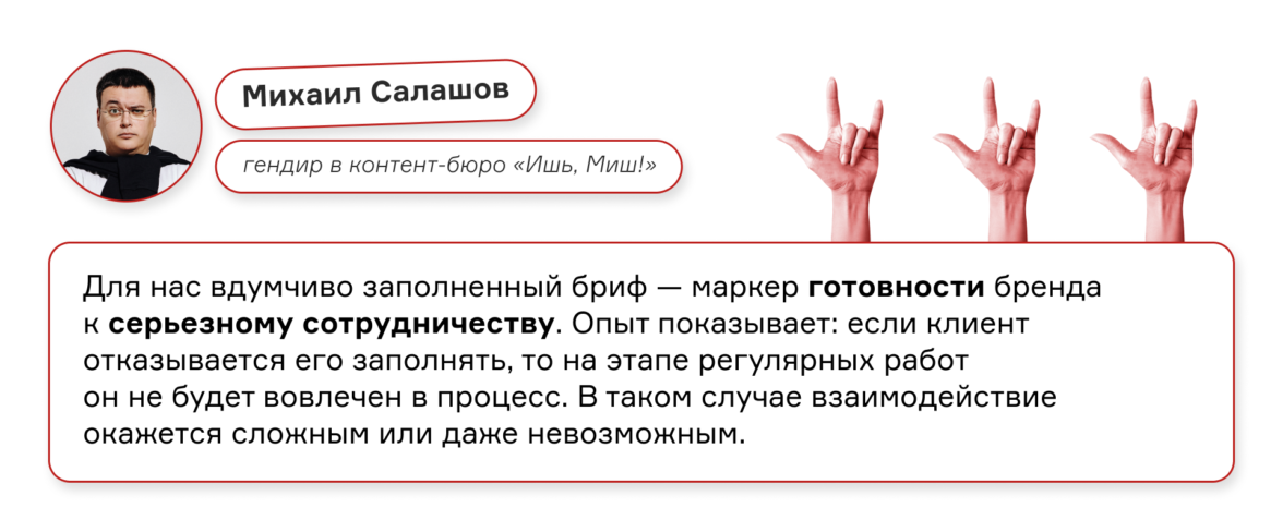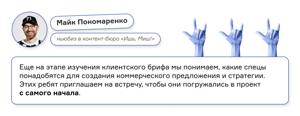 За 8 лет работы «Ишь, Миш!» разработал собственный подход к брифованию, который помогает собрать всю необходимую информацию и за 5–7 дней составить крутое коммерческое предложение.