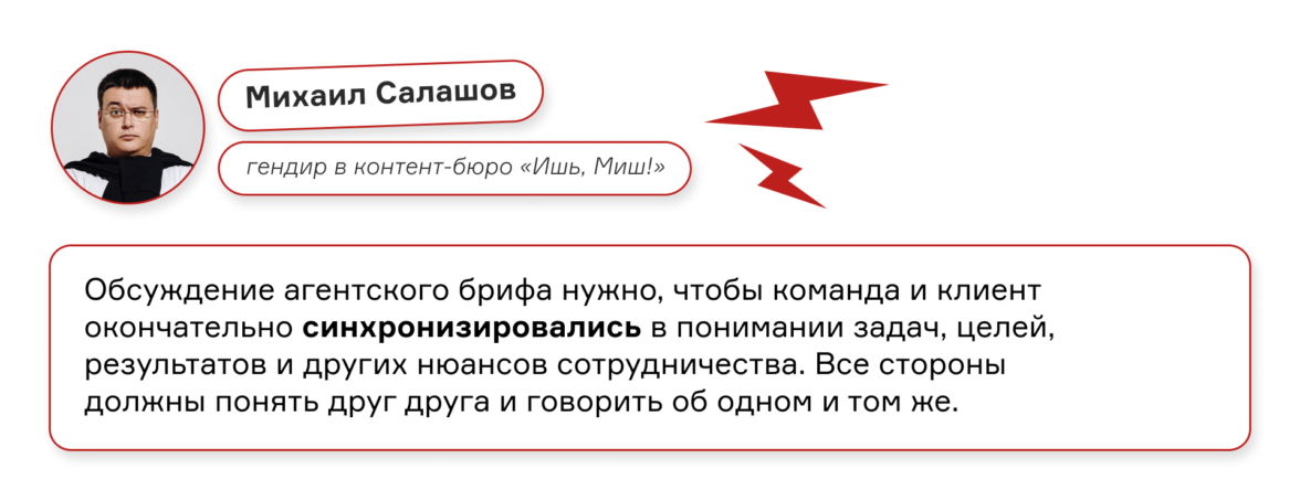 Обсуждение агентского брифа дает обеим сторонам возможность структурировать информацию и «подсветить» слабые места, а порой помогает самому заказчику увидеть проект со стороны.