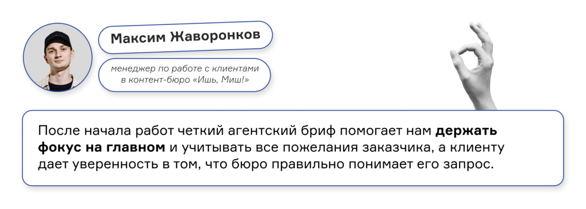 На этапе подготовки предложения информация из агентского брифа помогает нам обозначить для клиента подход к работе с проектом: