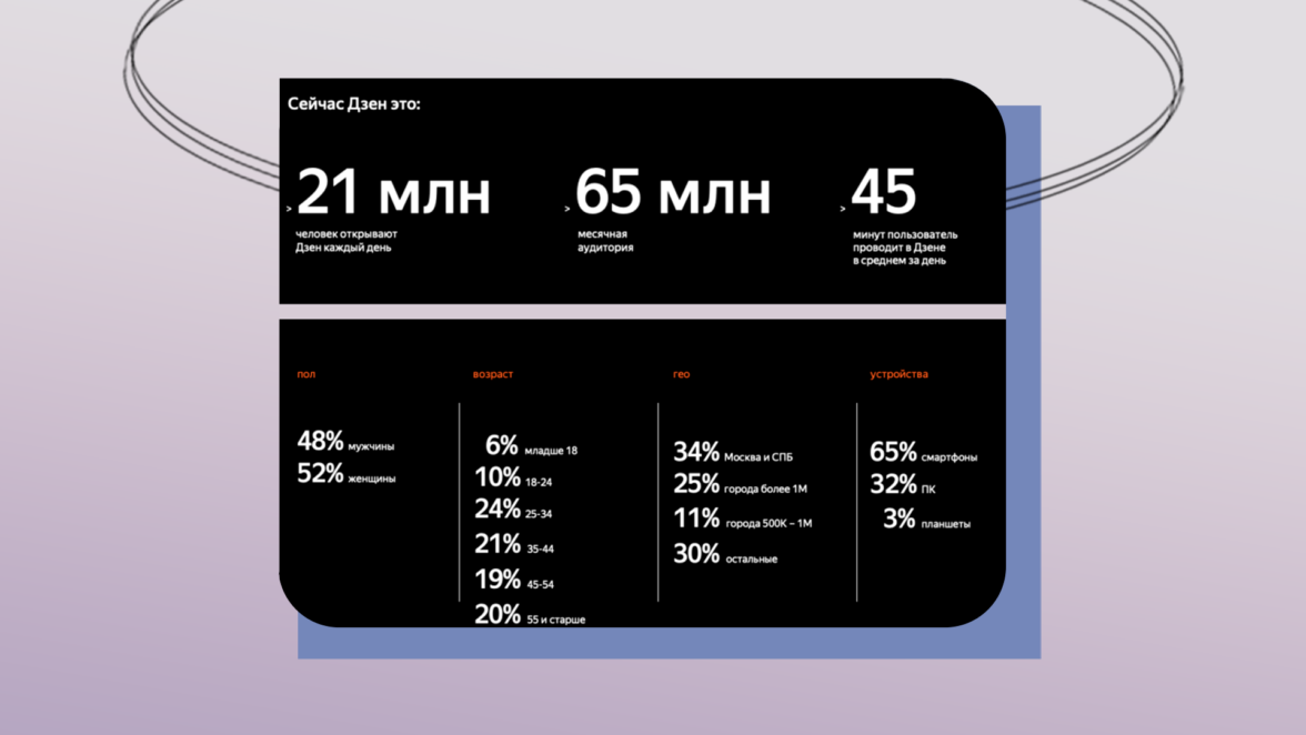 Месячная аудитория «Дзена» составляет 65 млн человек, а 21 млн — открывают сервис каждый день. Из статистики ясно, что со смартфонов «Дзен» читается гораздо чаще, а вот среди возрастных групп преобладают люди после 25 лет.