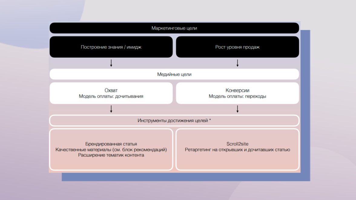 Рост уровня продаж. Здесь основная цель — конверсии. Прибегаем к формату scroll to site. Он предполагает переход пользователя на сайт после прочтения статьи и хорошо помогает для сложных продуктов, которые требуют объяснения.