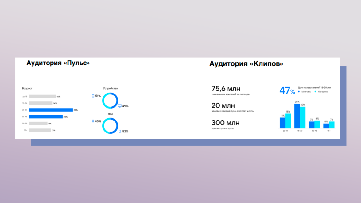 Основное ядро «Пульса» – люди от 25 до 45 лет. Пользователи разных полов используют мобильные и веб-устройства примерно 50 на 50.А вот ядро клипов совсем другое – 47% всей аудитории приходится на мужчин и женщин в возрасте от 18 до 30. Гендерное распределение примерно одинаковое.