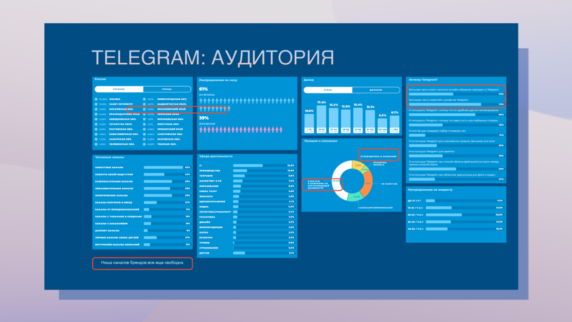Мужчин на площадке большинство — 61%. Важно, что ниша брендовых каналов ещё не занята. По статистике, люди чаще заходят в телеграм-каналы с новостями, развлечениями или политической повесткой.