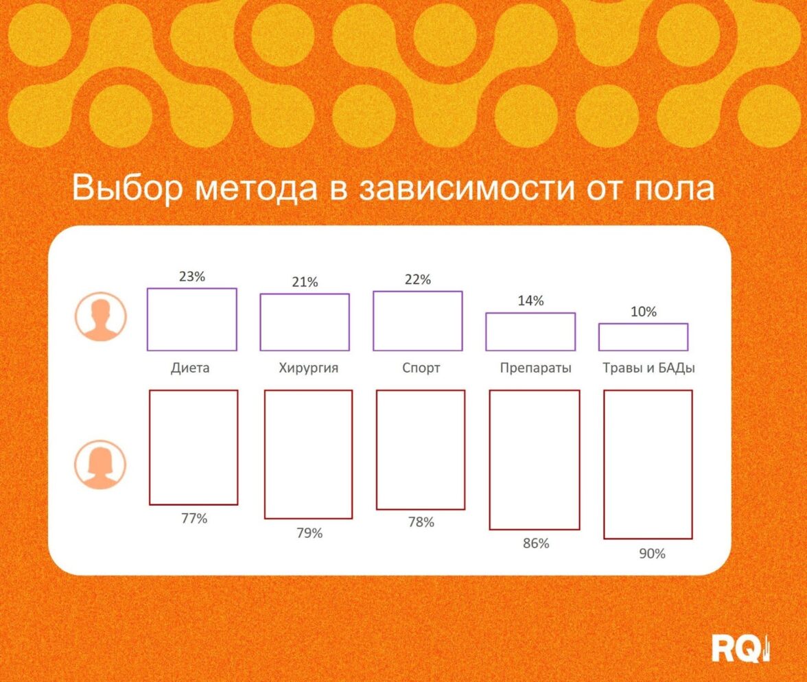 Выбор методов похудения отличается для авторов разного пола. Мужчины предпочитают диету, хирургию и спорт (23%, 21% и 22% соответственно) лекарственным препаратам, травам и БАДам (14% и 10%). Женщины чаще выбирают травы и БАДы, препараты и хирургию (90%, 86% и 79%).