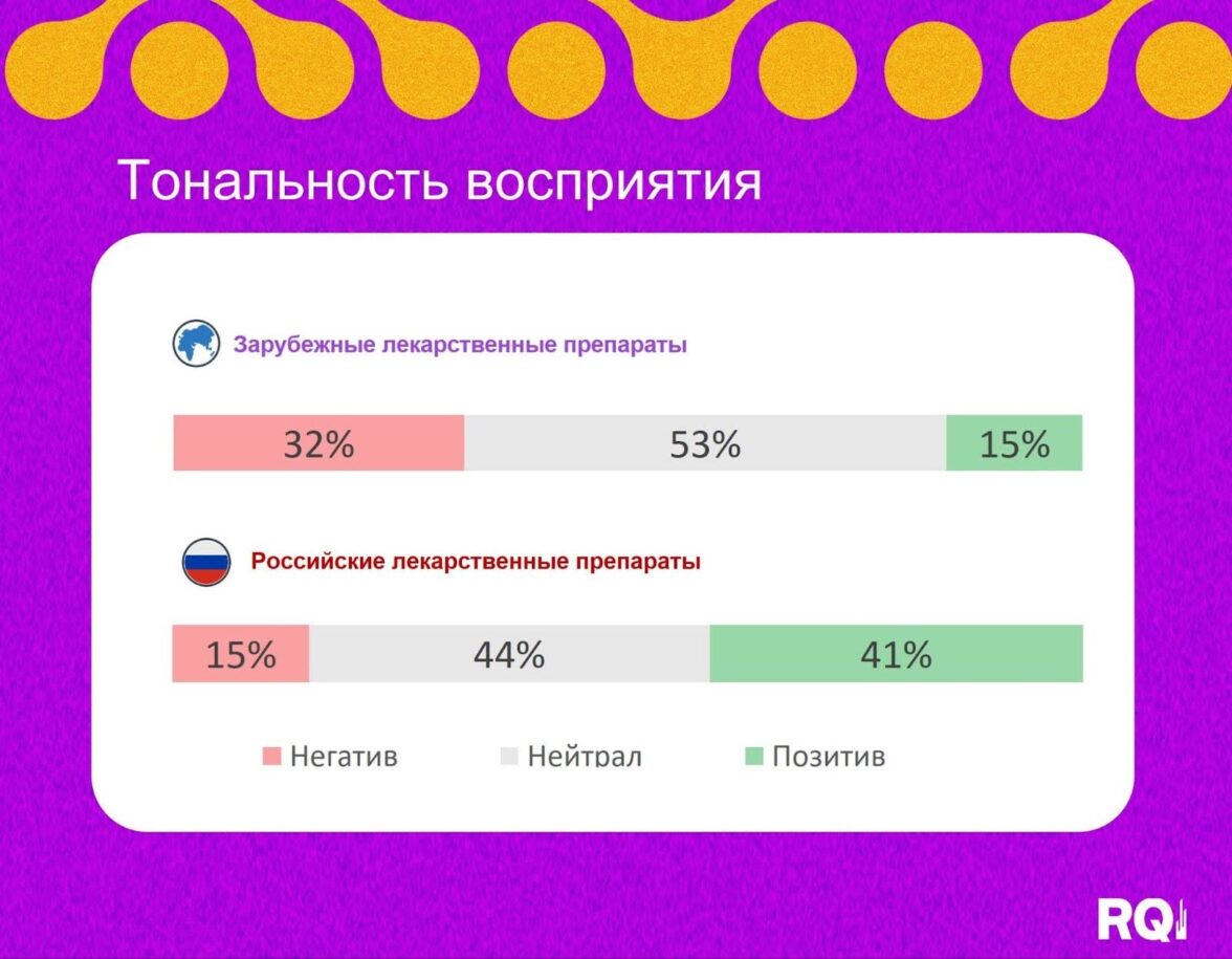 Но главное — разница в восприятии: российские лекарства упоминаются позитивно в 2,7 раза чаще (41% против 15%), а негатив в два раза чаще связан с зарубежными препаратами (32% против 15%).