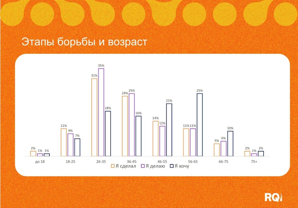 Наиболее активно личным опытом в теме похудения делятся люди 26–45 лет. Если рассматривать различия по возрасту, то те, кто имел опыт уменьшения веса или в настоящее время находится в процессе, чаще встречаются среди возрастной группы 26–45 лет — 55% и 60% соответственно. Те, кто только планирует похудеть, больше всего представлены в категории 46–55 лет (46%).