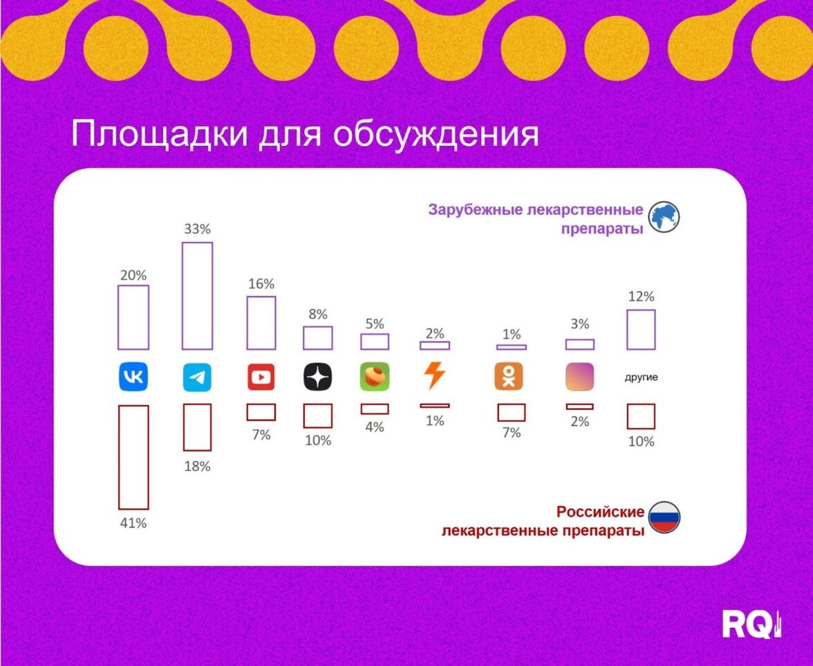 Российские препараты чаще обсуждают «ВКонтакте» (41%), а зарубежные — в Telegram (33%).