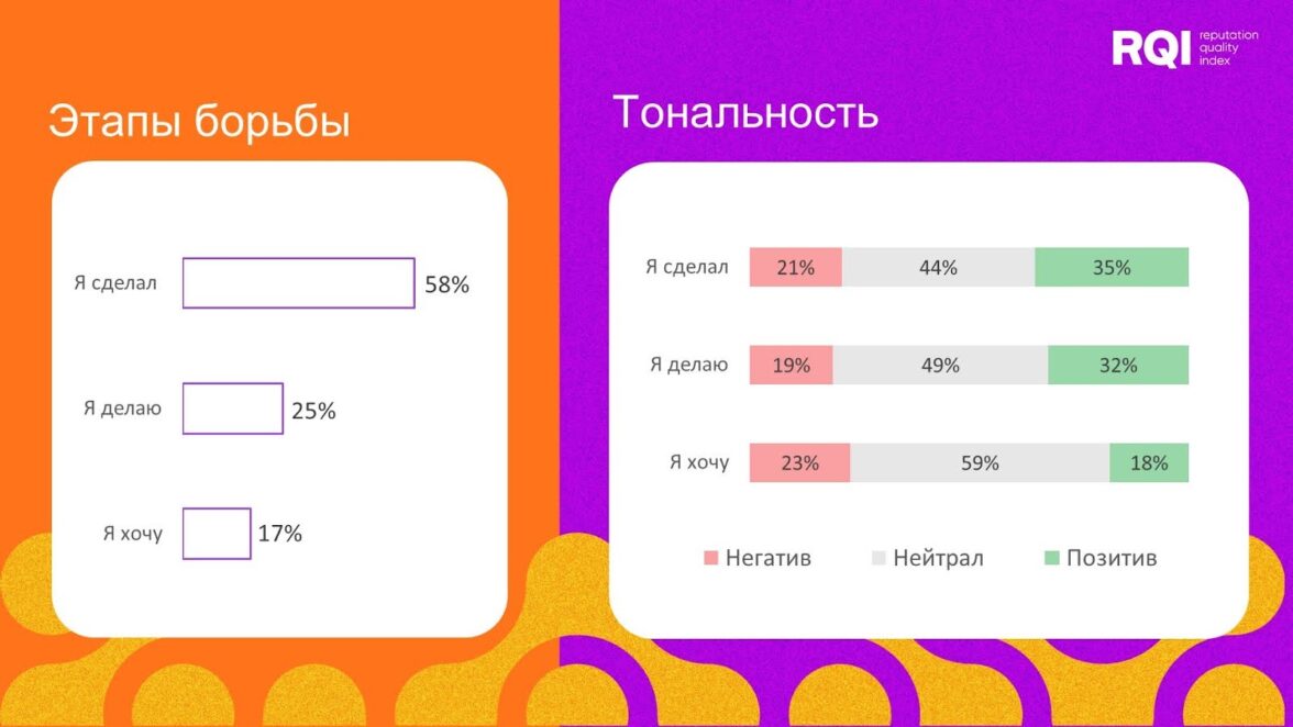 Оптимизм выражают те, кто уже похудел или худеет сейчас — 32–35% позитивных отзывов). Те же, кто только собирается, настроены сдержаннее — всего 18% позитива. В частности, те, кто описывает свой прошлый опыт в негативном ключе, составляют 21%.